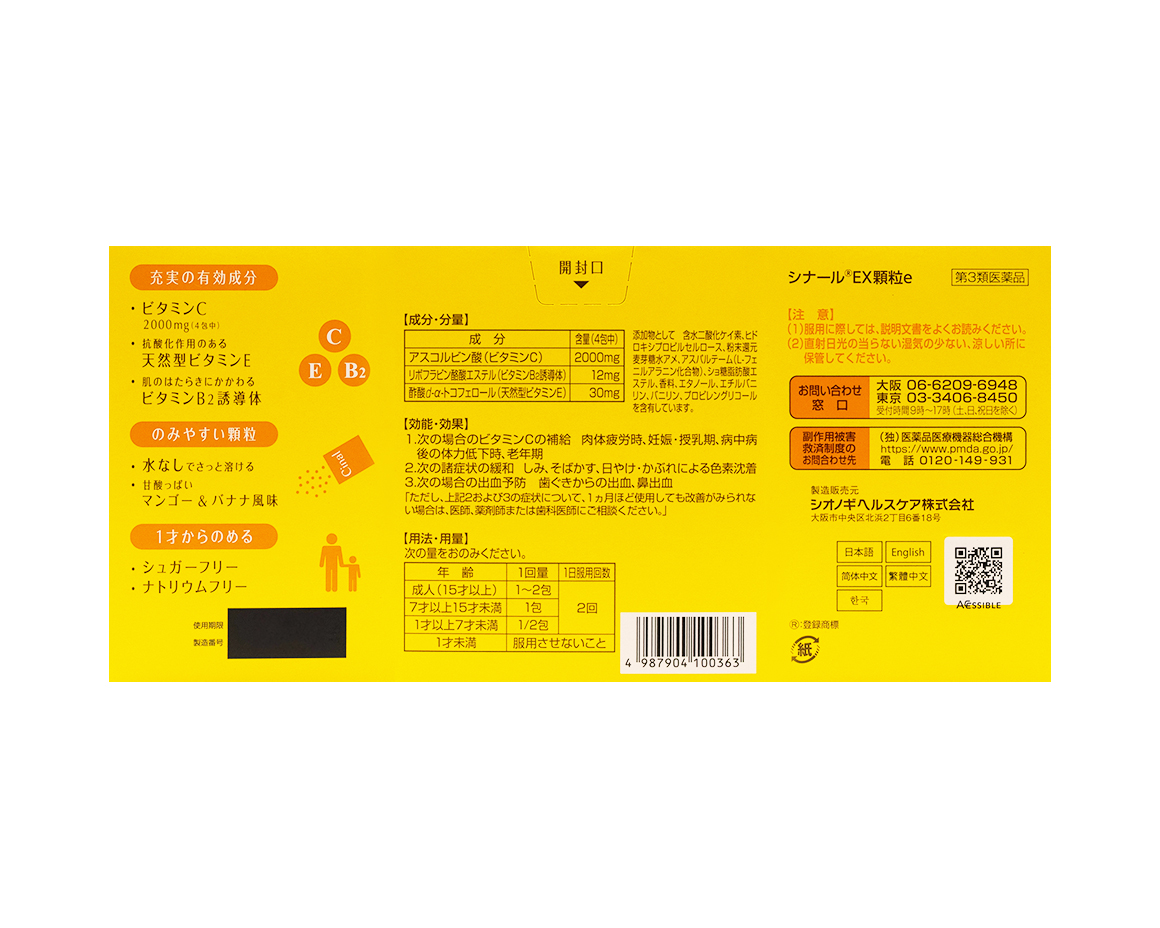 シナールEX顆粒eは、黄色の顆粒剤で、4包(1.0g×4・成人1日最大量)中に次の成分を含有しています。