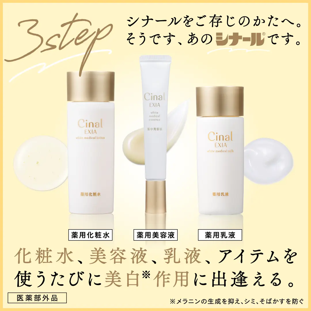 〈シナール式|シミ抑制※メソッド〉できる限りのシミの打ち手を。化粧水、美容液、乳液。すべてのstepで美白※作用に出逢える。