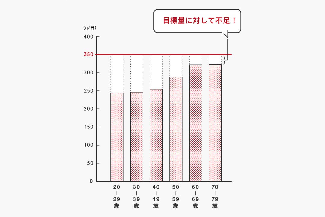 厚生労働省が推進する「健康日本21」では、野菜の1日摂取目標量が350gとなっていますが、全世代で目標量に対して不足しています。毎日を元気に過ごすためにも、野菜をしっかり摂ることが必要です。