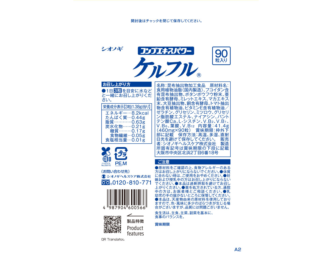 - 食用植物油脂(国内製造)、フコイダン含有昆布抽出物、ボタンボウフウ粉末、亜鉛含有酵母、ミレットエキス、マカエキス末、大豆抽出物、銅含有酵母、トマト抽出物含有植物油、ビタミンE含有植物油/ゼラチン、グリセリン、ミツロウ、グリセリン脂肪酸エステル、ナイアシン、パントテン酸Ca、L-シスチン、V.B2、V.B1、V.B6、葉酸、V.B12