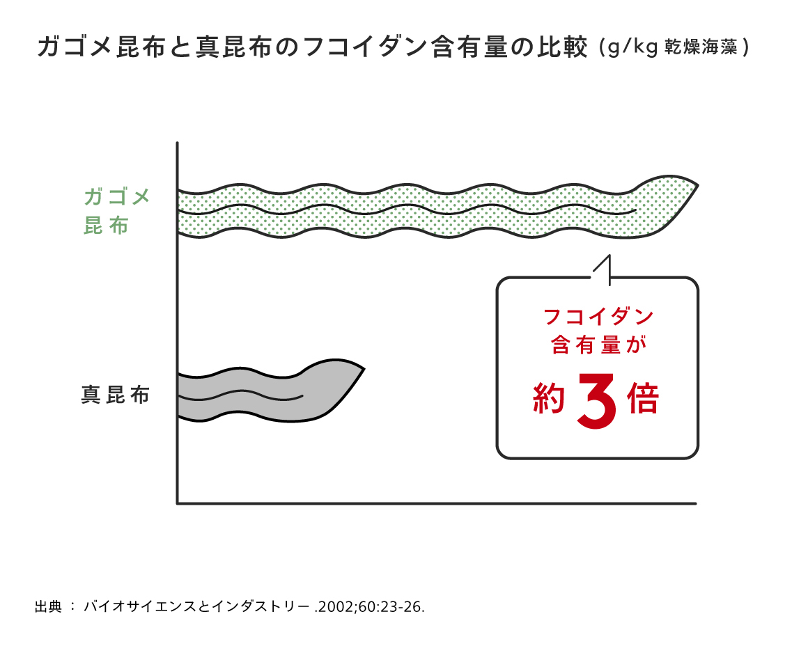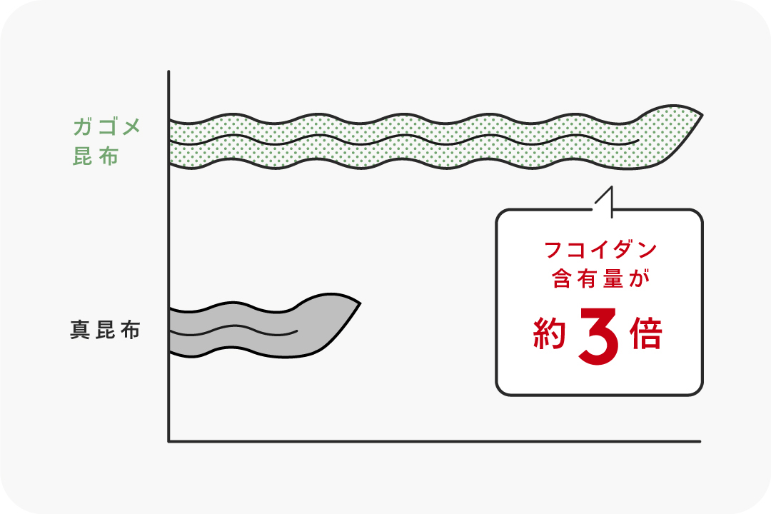ガゴメ昆布に含まれる「フコイダン」は、他の昆布に比べて非常に多く、真昆布の約3倍の量を含んでいます。そのことからも、ガゴメ昆布は人類が発見した新たな宝とも呼ばれています。
