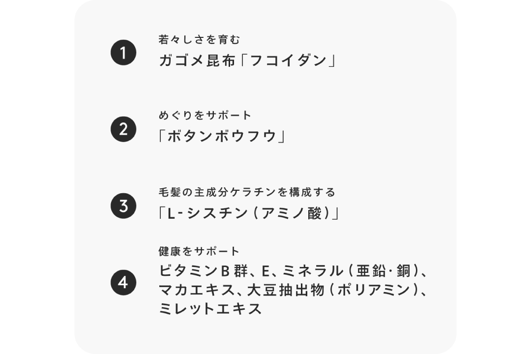 ハリ・ツヤをサポートし、若々しさを育む力を持つ「フコイダン」に加え、毛髪の主成分ケラチンを構成する「L-シスチン」など10種類以上の健康成分を配合しています。