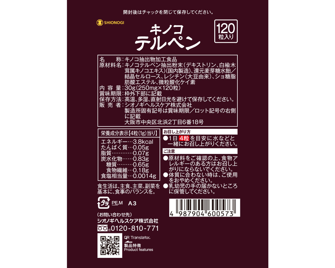 - キノコテルペン抽出粉末(デキストリン、白楡木茸属キノコエキス)(国内製造)、還元麦芽糖水飴/結晶セルロース、レシチン(大豆由来)、ショ糖脂肪酸エステル、微粒酸化ケイ素