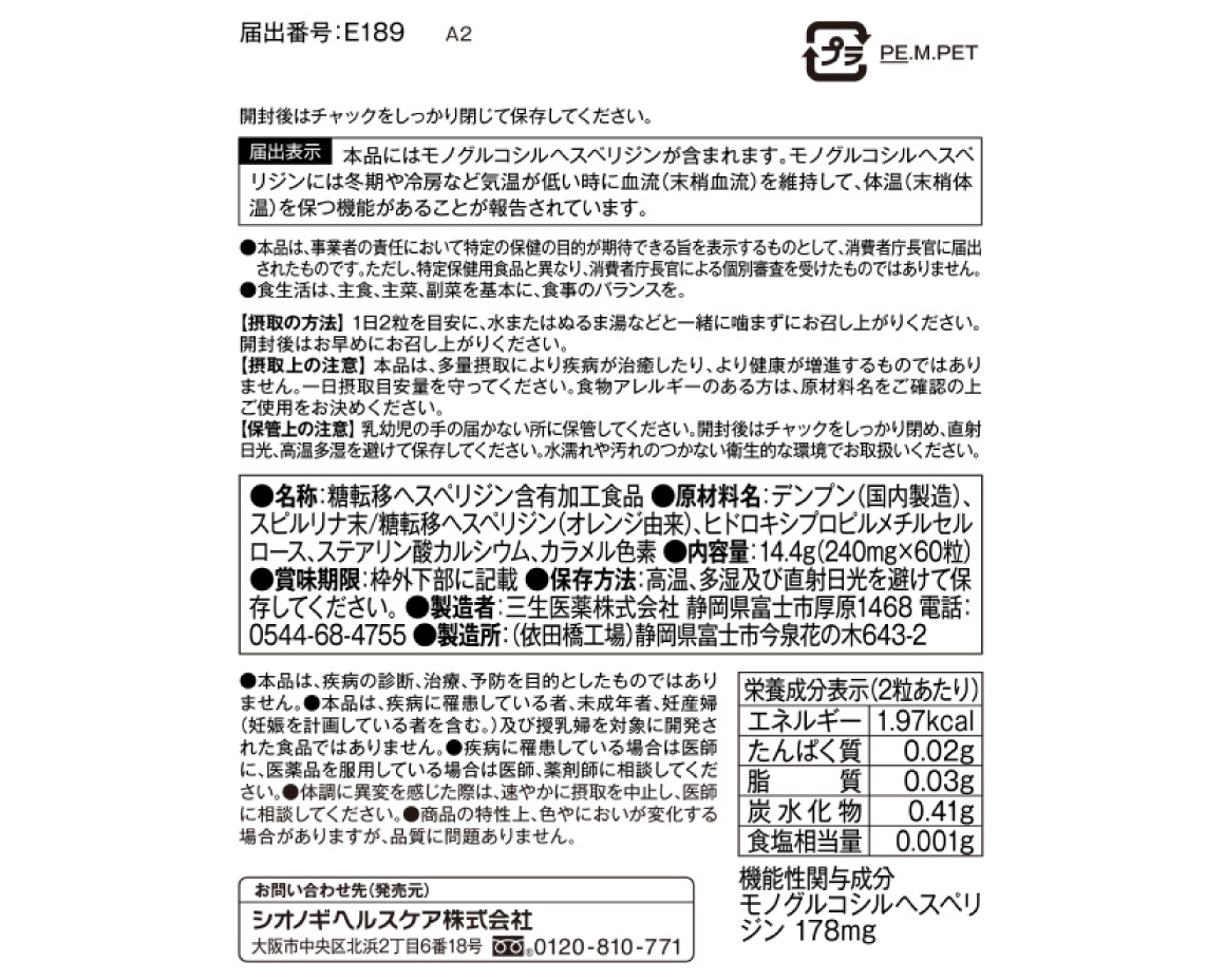<届出表示>本品にはモノグルコシルヘスペリジンが含まれます。モノグルコシルヘスペリジンには冬期や冷房など気温が低い時に血流(末梢血流)を維持して、体温(末梢体温)を保つ機能があることが報告されています。