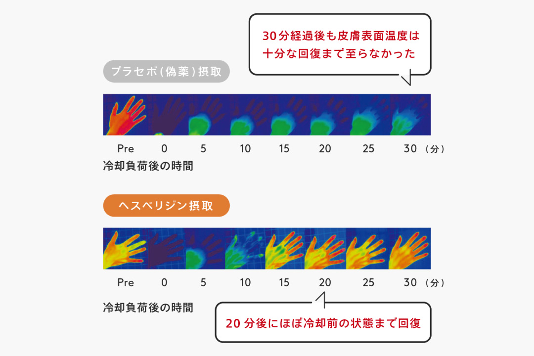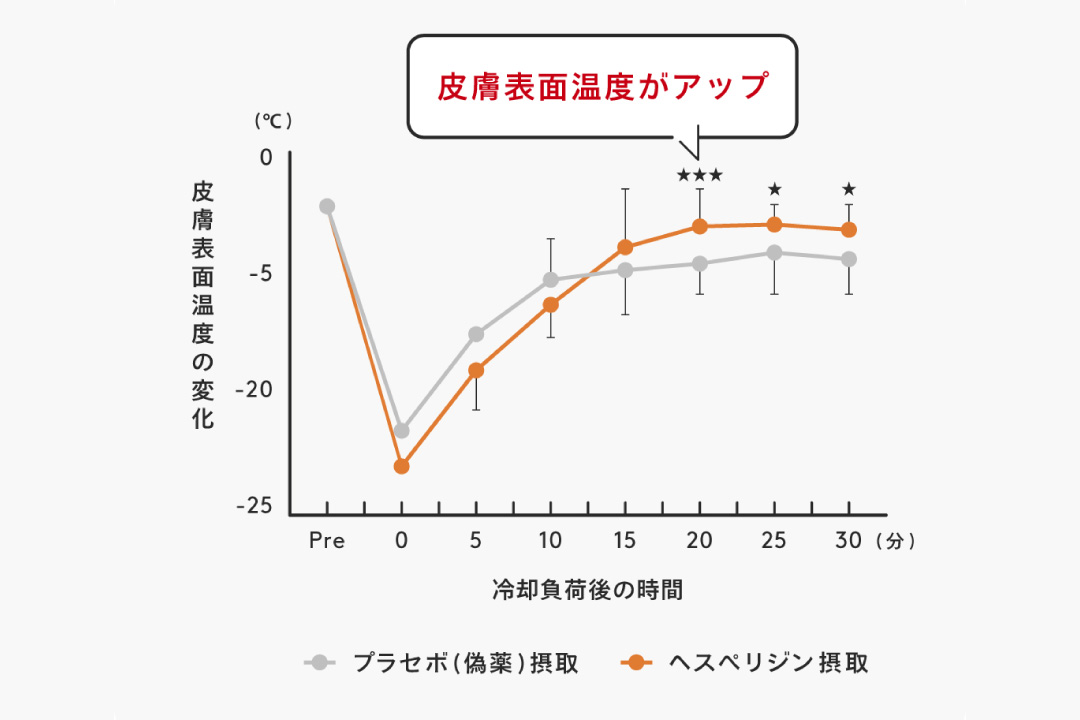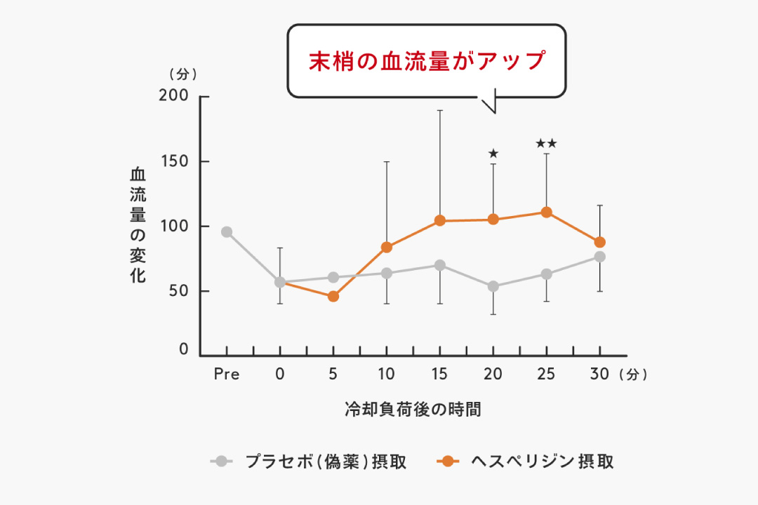 【試験概要】冷え性の女性11名(29.6±39.歳)を対象に、二重盲検交差法により試験を実施。測定開始の40分前にプラセボ(粉糖、250mg/日)またはモノグルコシルヘスペリジンを摂取し、水温15℃の冷水中に手首まで1分間浸水した後、5分ごとに皮膚血流量と皮膚表面温度を測定、比較。