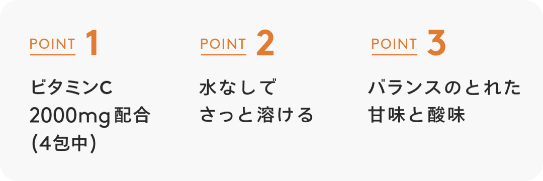 ビタミンCには人の体内で40ものはたらきがあると言われています。例えば、しみ、そばかすの抑制や、コラーゲンの生成促進などお肌に嬉しいはたらきも。 しかし一方で、人は、体の中でビタミンCをつくることができないため、毎日摂取することが大切です。