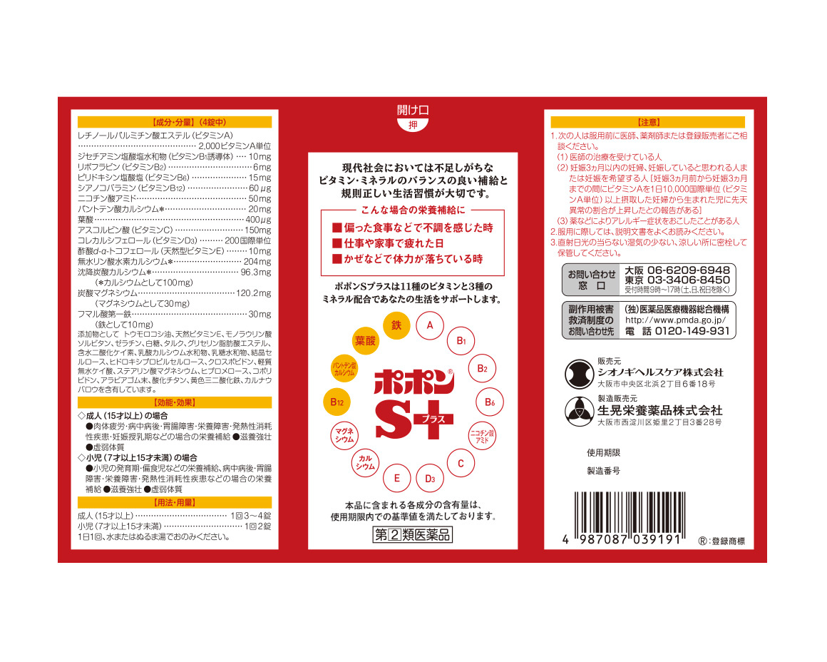 ポポンS プラスは、淡黄白色の糖衣錠で、4錠(成人1日最大量)中に次の成分を含有しています。【添加物】成分 含量 レチノールパルミチン酸エステル(ビタミンA) 2,000ビタミンA単位 セトチアミン塩酸塩水和物(ビタミンB1誘導体) 10mg リボフラビン(ビタミンB2) 6mg ピリドキシン塩酸塩(ビタミンB6) 15mg シアノコバラミン( ビタミンB12) 60μg ニコチン酸アミド 50mg パントテン酸カルシウム* 20mg 葉酸 400μg アスコルビン酸(ビタミンC) 150mg コレカルシフェロール(ビタミンD3) 200国際単位 酢酸d-α-トコフェロール(天然型ビタミンE) 10mg 無水リン酸水素カルシウム* 204mg 沈降炭酸カルシウム* 96.3mg (*カルシウムとして100mg) 炭酸マグネシウム 120.2mg (マグネシウムとして30mg) フマル酸第一鉄 30mg (鉄として10mg)