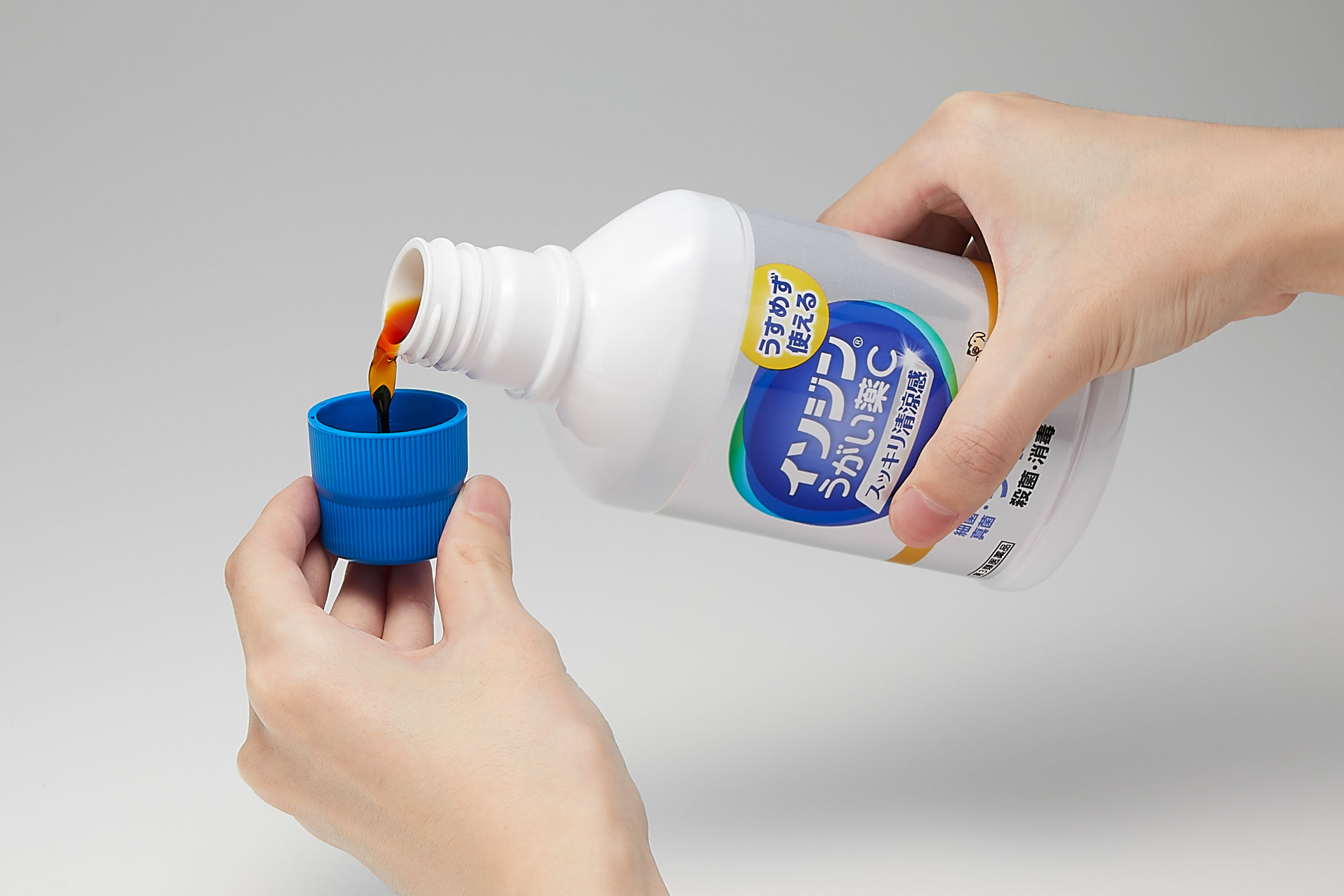 うすめずにそのまま適量(約15~20mL)を口に含んで、2~3回うがいをする。これを1日数回行ってください。
