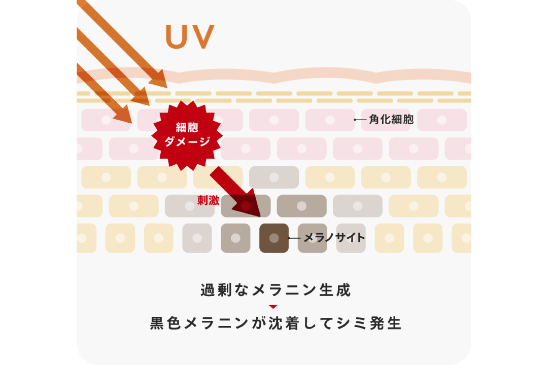 紫外線によって受けた肌細胞のDNAダメージが修復されず、暴走するかのようにシミの元となる黒色メラニンが作られ続けてしまいます。