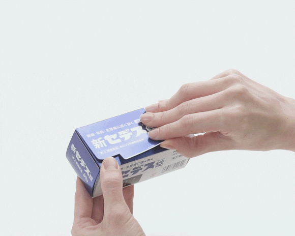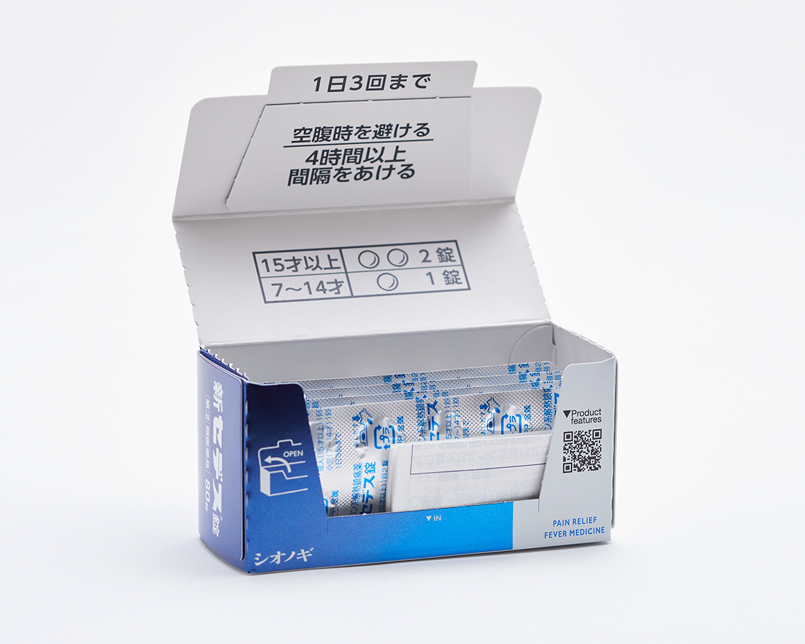 開け口が触覚的にわかり、錠剤が取り出しやすいように、大きく開く前開きを採用。また、開いたフタの裏面には大きな文字で用法や用量を記載し、高齢者や弱視の方でも読みやすい仕様になっています。