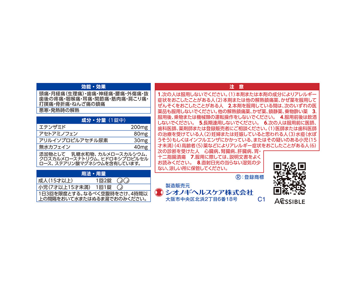 - ・頭痛・月経痛(生理痛)・歯痛・神経痛・腰痛・外傷痛・抜歯後の疼痛・咽喉痛・耳痛・関節痛・筋肉痛・肩こり痛・打撲痛・骨折痛・ねんざ痛の鎮痛