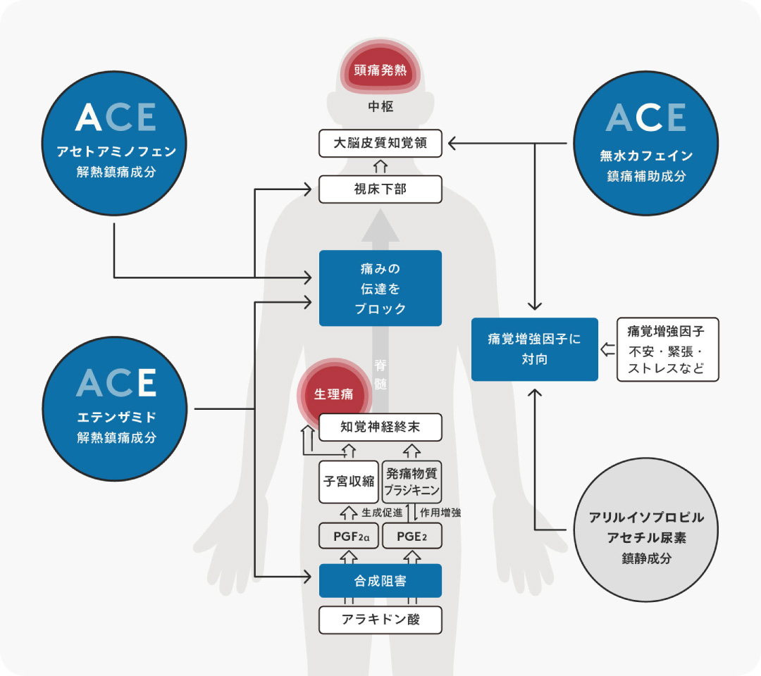 アセトアミノフェン(A)、カフェイン(C)、エテンザミド(E)を組み合わせた処方で作用機序の違う成分を配合することにより相乗的な効果が期待されます。セデスのACE処方は、安全性と効き目を考えて、エテンザミドとアセトアミノフェンを5:2の比率で配合したシオノギ独自の処方です。