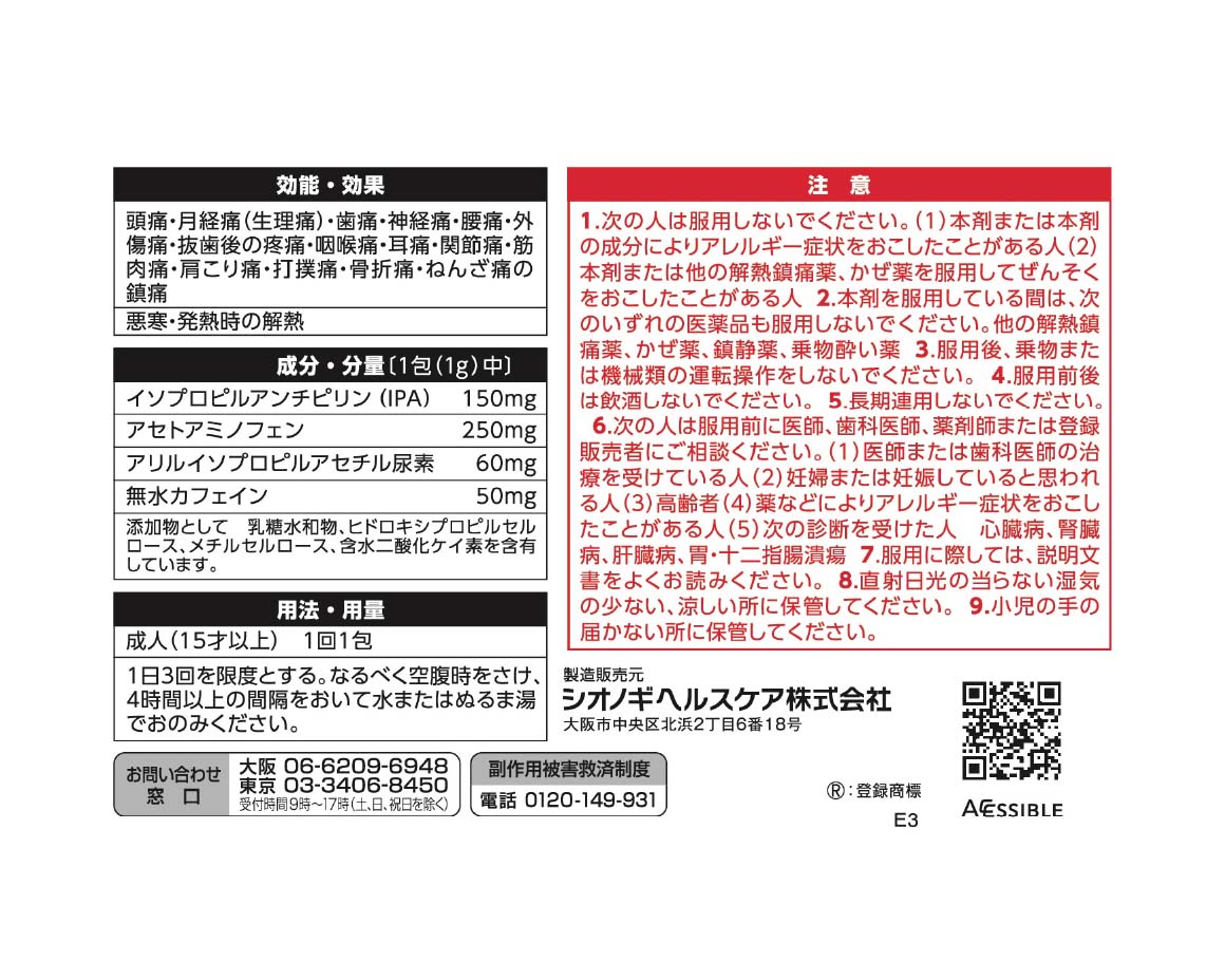 - ・頭痛・月経痛(生理痛)・歯痛・神経痛・腰痛・外傷痛・抜歯後の疼痛・咽喉痛・耳痛・関節痛・筋肉痛・肩こり痛・打撲痛・骨折痛・ねんざ痛の鎮痛