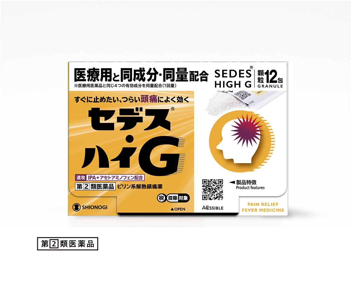 『セデス・ハイG』は、鎮痛作用の強いイソプロピルアンチピリン(IPA)をはじめ4種類(イソプロピルアンチピリン、アセトアミノフェン、アリルイソプロピルアセチル尿素、無水カフェイン)の成分を配合することにより、強い痛みにもすぐれた鎮痛効果をあらわします。