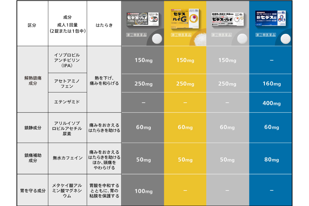 配合成分や剤形など様々なタイプをご用意しております。あなたに合った『セデス』をお選びください。