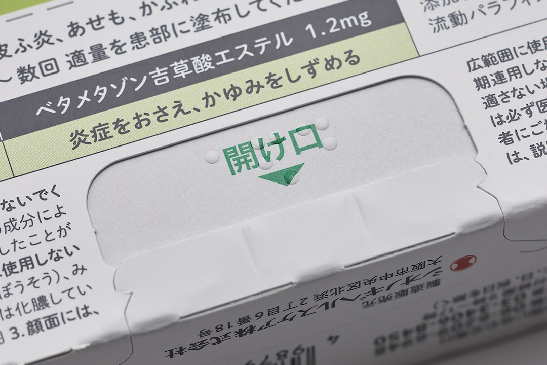 開けやすいプルオープン式の個装箱に、皮膚外用剤初である点字加工で「あける」と開け口に記載。「アクセシブルコード」と組み合わせ、視覚障がいのある方でも安心して使用が可能です。