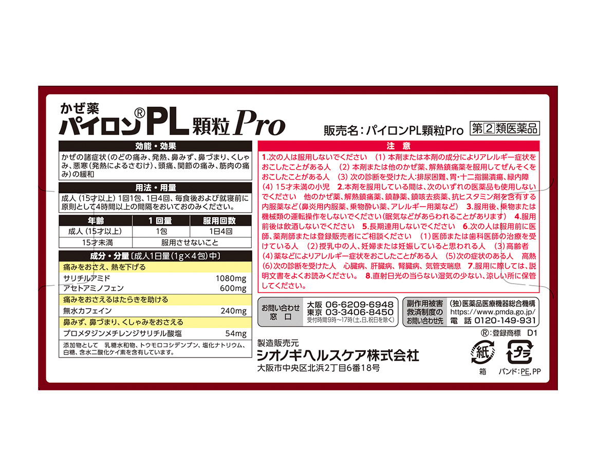 パイロンPL顆粒Proは、白色の顆粒で、4包(1g×4・成人1日量)中に次の成分を含有しています。【添加物】成分 含量(4包中) サリチルアミド 1080mg アセトアミノフェン 600mg 無水カフェイン 240mg プロメタジンメチレンジサリチル酸塩 54mg