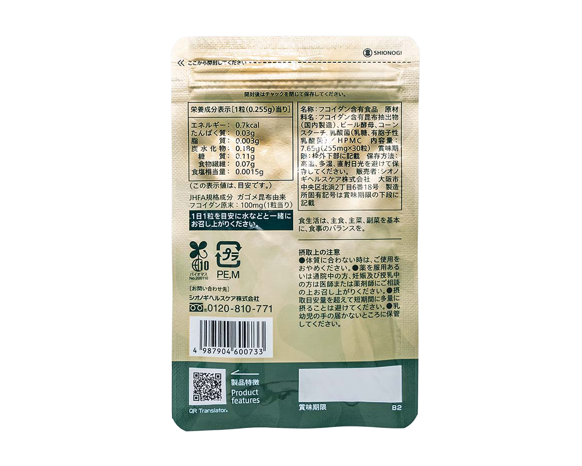 フコイダン含有昆布抽出物(国内製造)、ビール酵母、コーンスターチ、乳酸菌(乳糖、有胞子性乳酸菌)/HPMC
