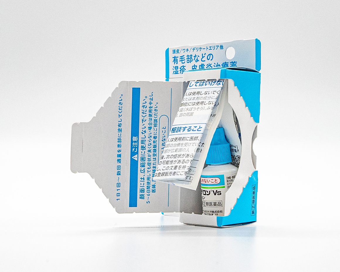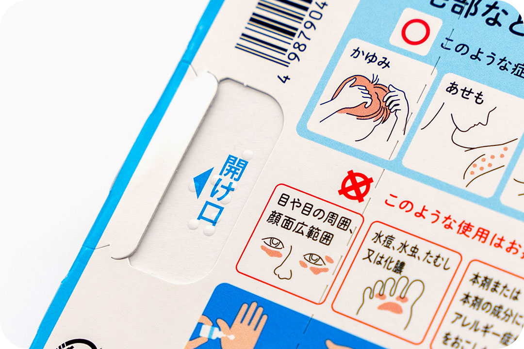 開けやすいプルオープン式の個装箱に、皮膚外用剤初である点字加工で「あける」と開け口に記載。「アクセシブルコード」と組み合わせ、視覚障がいのある方でも安心して使用が可能です。