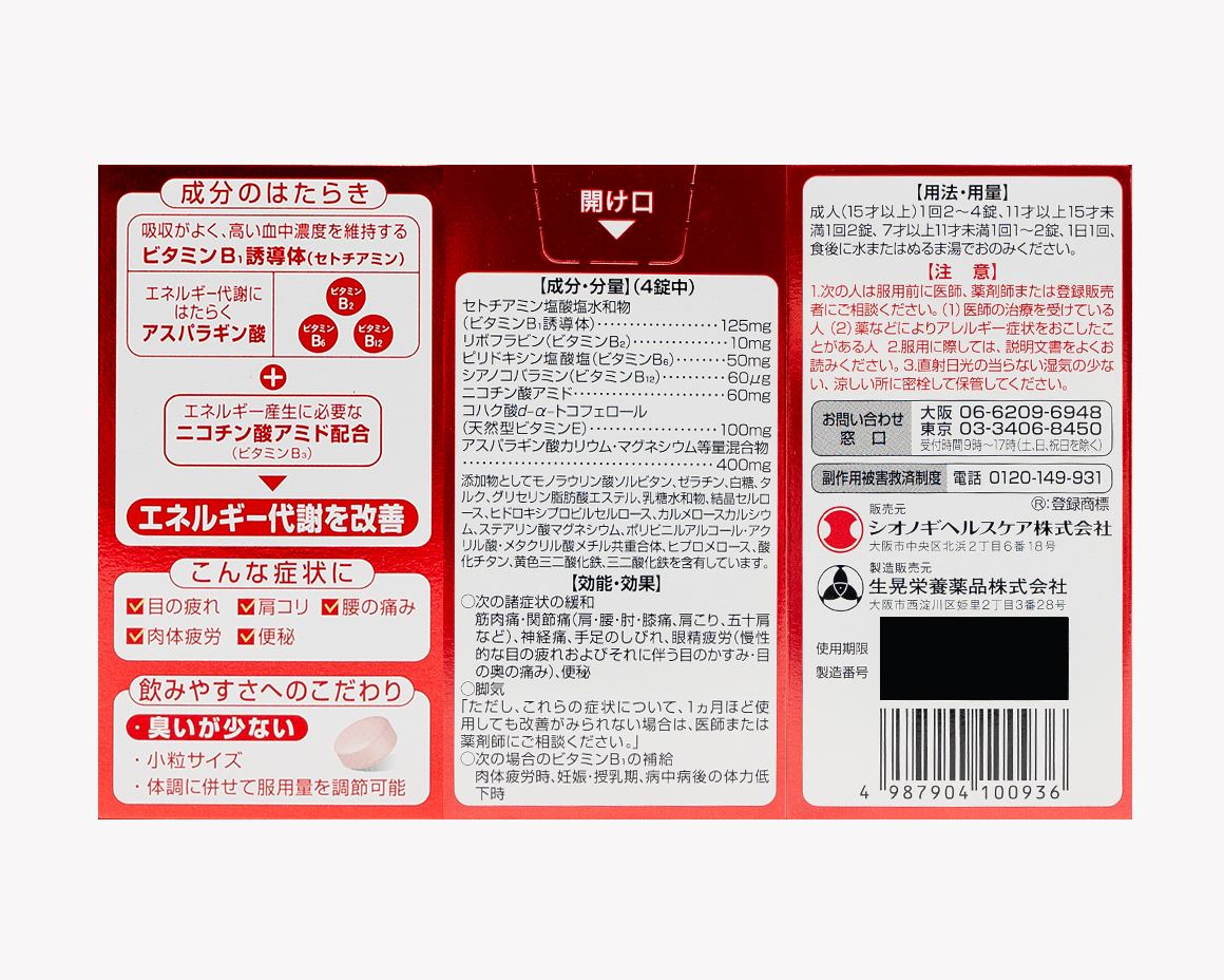体外へ排出されやすい水溶性ビタミンであるビタミンB1の弱点をカバーできるよう、吸収性・持続性の良いビタミンB1誘導体「セトチアミン塩酸塩水和物」を主成分にしています。