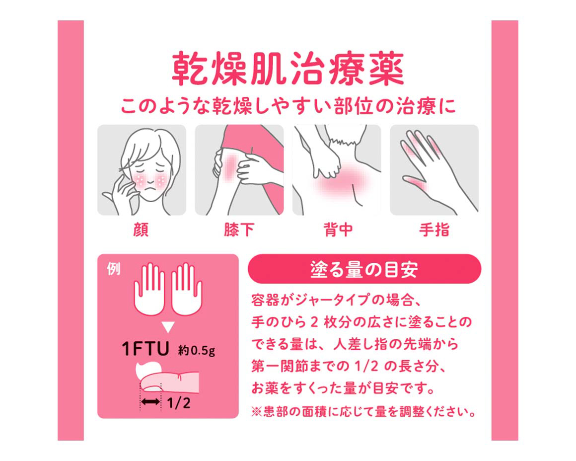 成分 分量(100g中) はたらき ヘパリン類似物質 0.3g 保湿、皮膚修復の作用があり、つらい乾燥肌、角化症に効果があります。 パンテノール 1.0g 乾燥を受けた肌のバリア機能を修復します。 グリチルリチン酸二カリウム 0.5g 皮膚や炎症の赤みを抑えます。 トコフェロール酢酸エステル 0.5g 血流の流れをよくするほか、炎症の拡大を防ぎます。