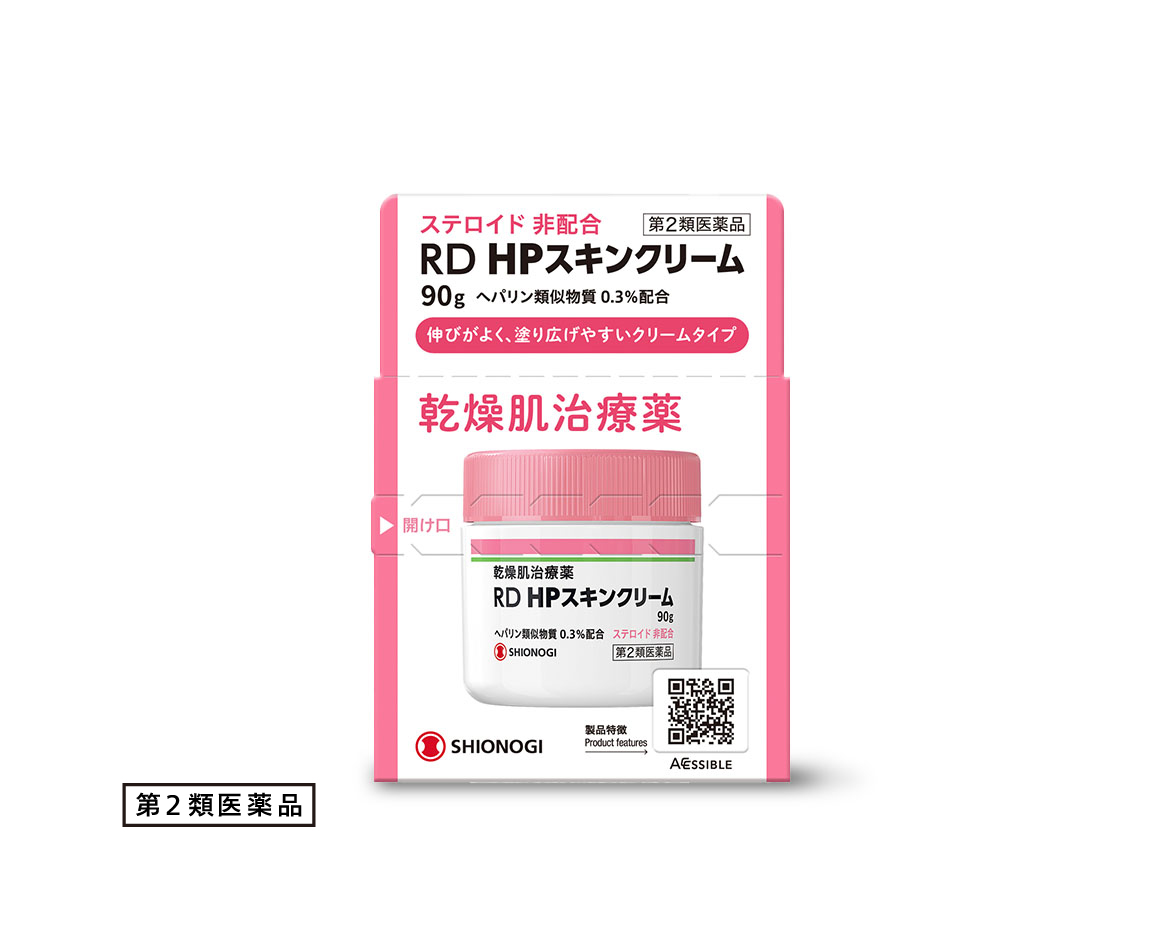 RD HPスキンクリームに含まれる「ヘパリン類似物質」は親水性・保水性が高く、乾燥しやすい膝下、背中、腰回り、顔など、カサカサしたり、白く粉ふきがある乾燥肌の症状を改善します。症状が悪化する前に、RD HPスキンクリームを使いましょう。