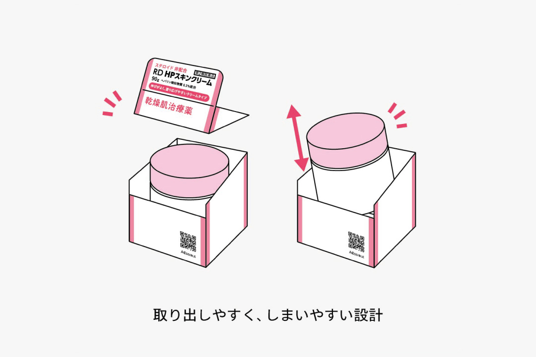 開封時に上蓋が切りとれるため、容器(ジャー)が取り出しやすく、しまいやすい箱になっています。日常的に使用されるお薬なので、上蓋があることで、容器(ジャー)を出し入れする際のわずらわしさを解消する設計としました。