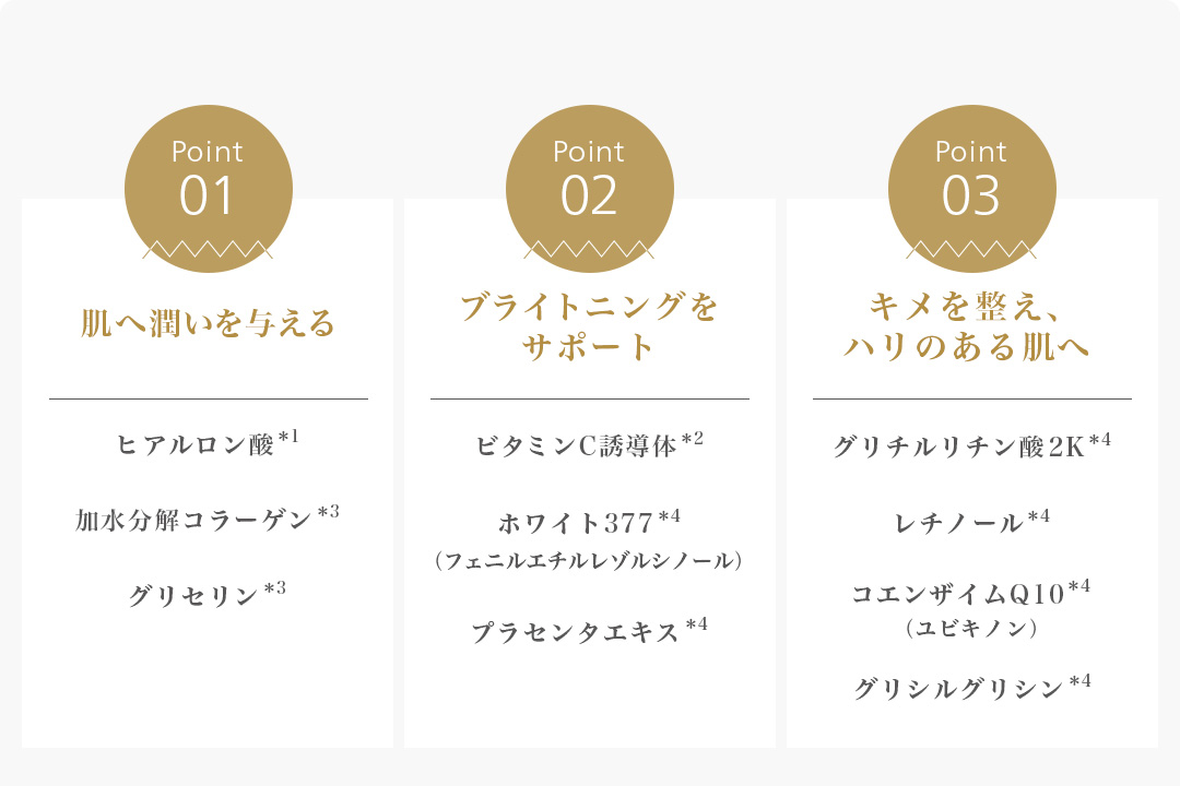 - ヒアルロン酸Na、プラセンタエキス(ウマ由来)、3-O-エチルアスコルビン酸、グリシルグリシン、グリセリン、加水分解コラーゲン、フェニルエチルレゾルシノール、グリチルリチン酸2K、アデノシン、コレステロール、ユビキノン、トリ(カプリル酸/カプリン酸)グリセリル、トコフェロール、アスコルビン酸Na、レチノイン酸トコフェリル、レチノール、レチナール、PEG-40水添ヒマシ油、シリカ