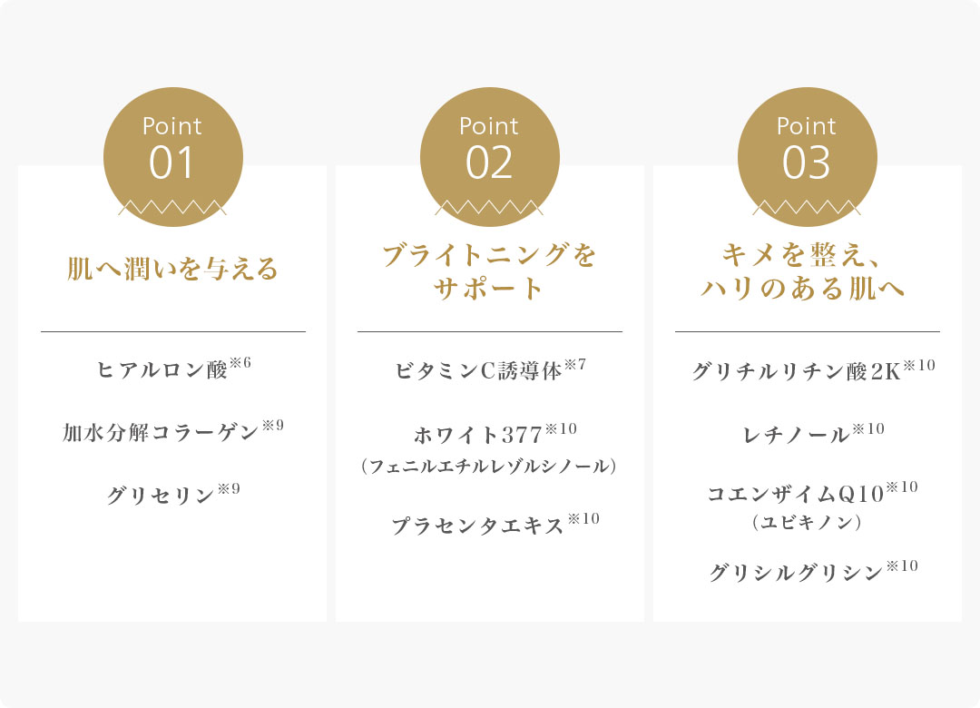 メラニンの生成を抑え、しみ、そばかすを防ぐ美白成分「ビタミンC誘導体※3」、「アルブチン※4」または「エラグ酸※4」と、炎症を抑え、肌あれを防ぐ抗炎症成分「トラネキサム酸」、「グリチルリチン酸ジカリウム」をそれぞれダブルで配合した、薬用美白※1シリーズです。