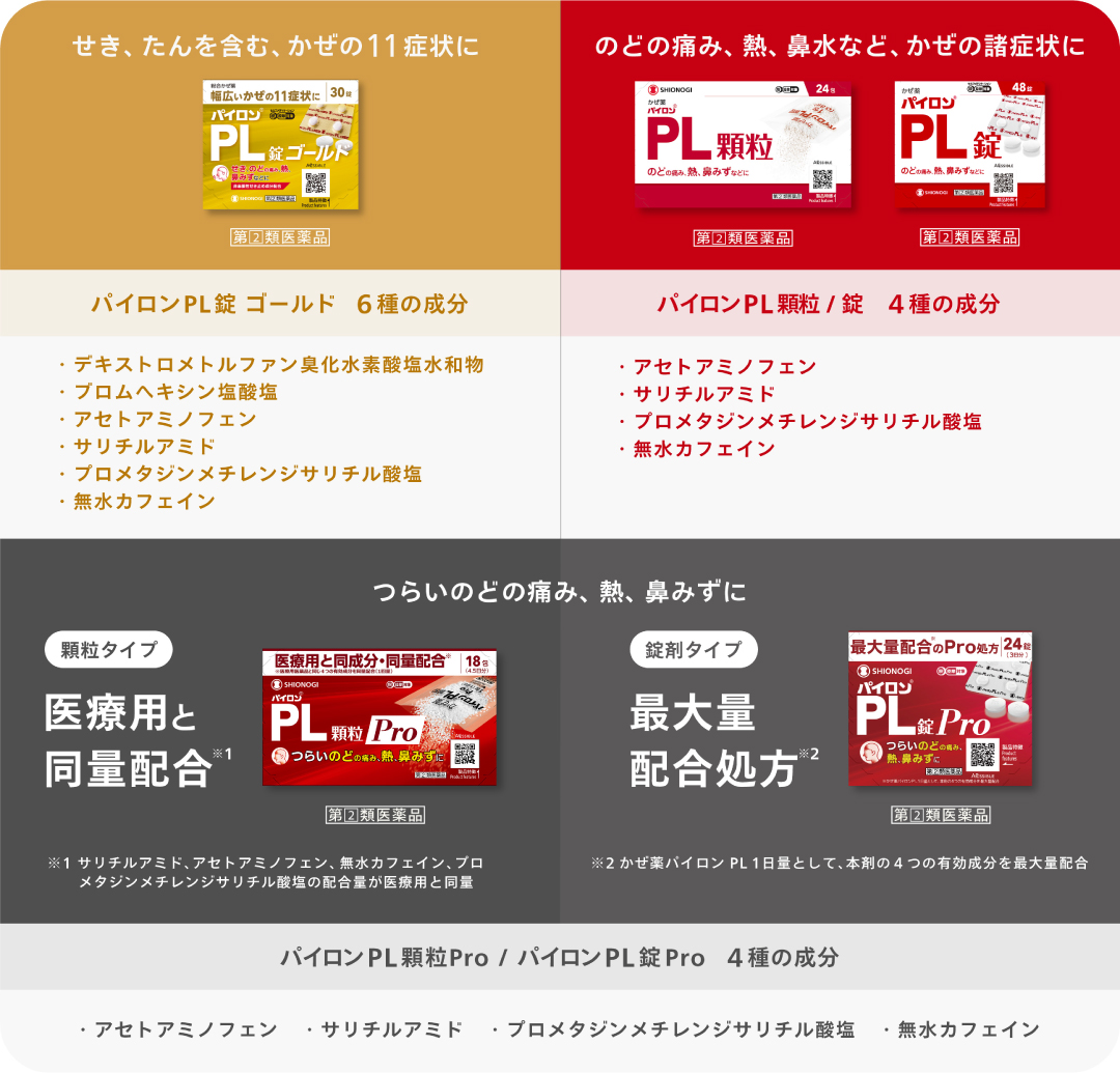配合成分や剤形など様々なタイプをご用意しております。あなたに合った『パイロンPL』をお選びください。