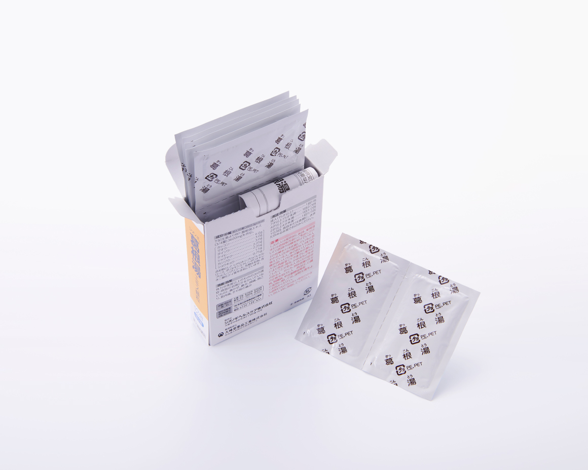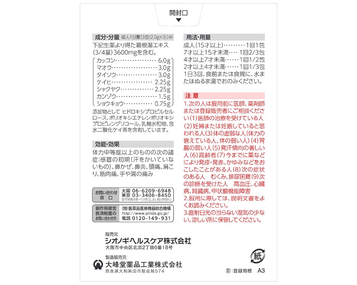 (3包中)葛根湯エキス(3/4量): カッコン 6.0g、マオウ 3.0g、タイソウ 3.0g、ケイヒ 2.25g、シャクヤク 2.25g、カンゾウ 1.5g、ショウキョウ 0.75g、より得たエキス 3600mg