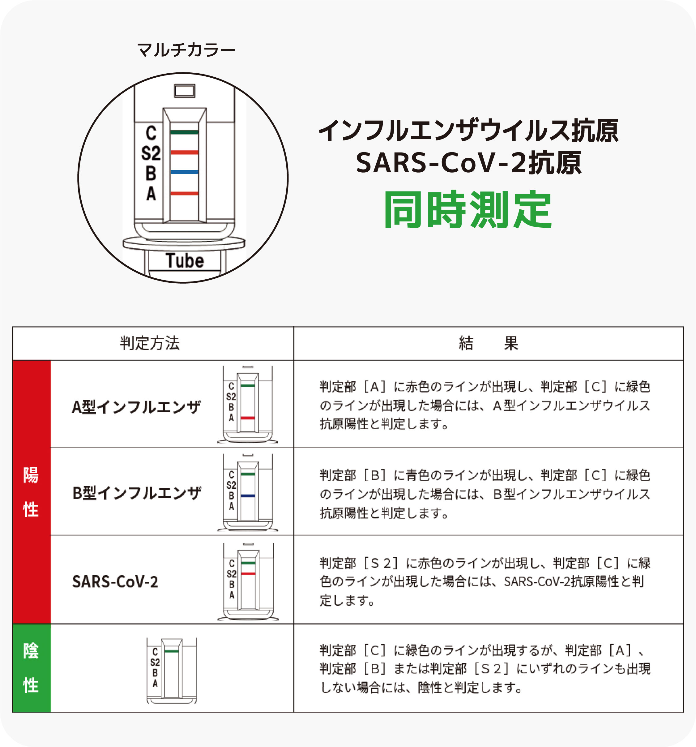 たとえ、判定部([A]、[B]又は[S2])が認められたとしても、判定部[C]にラインが認められないため、検査結果は無効です。新しい検査キットを用いて、もう一度、検査を行ってください。