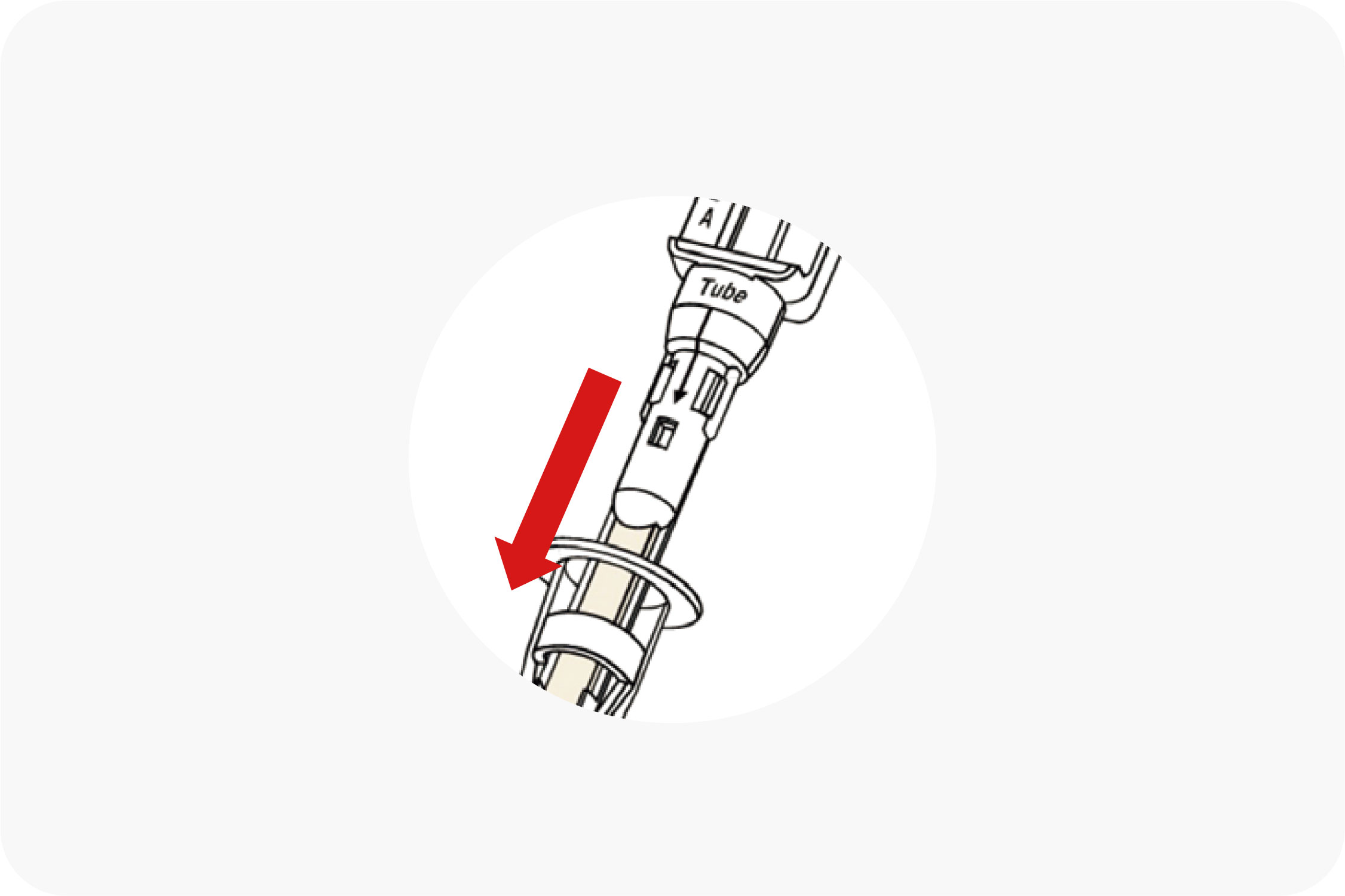 - 2.テストスティックを検体液入りチューブにまっすぐにゆっくりと挿入します。チューブとテストスティックの接合部に隙間が出来ないようにしっかりと差し込みます。(※テストスティックと検体液入りチューブの接合部分に隙間があると、正しく反応しない場合があります。また、隙間より内容物が漏れ出す可能性がありますので注意してください。)