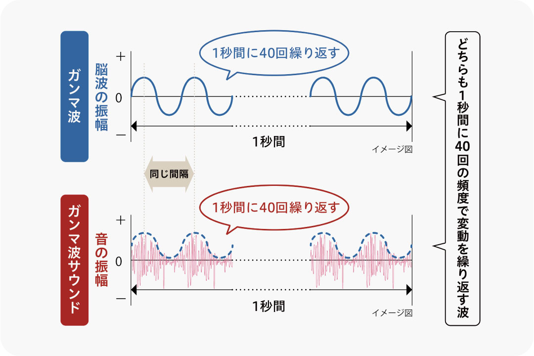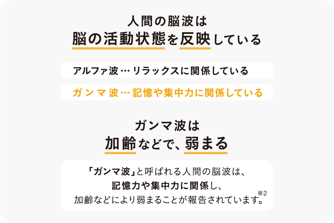 人間の主な脳波には「ガンマ波」「アルファ波」「ベータ波」などがあり、そのうち「ガンマ波」は記憶や集中力に関係し、加齢などにより弱まっていくことが報告されています。